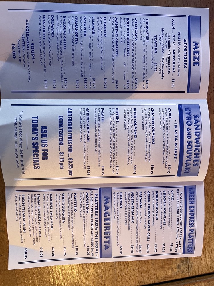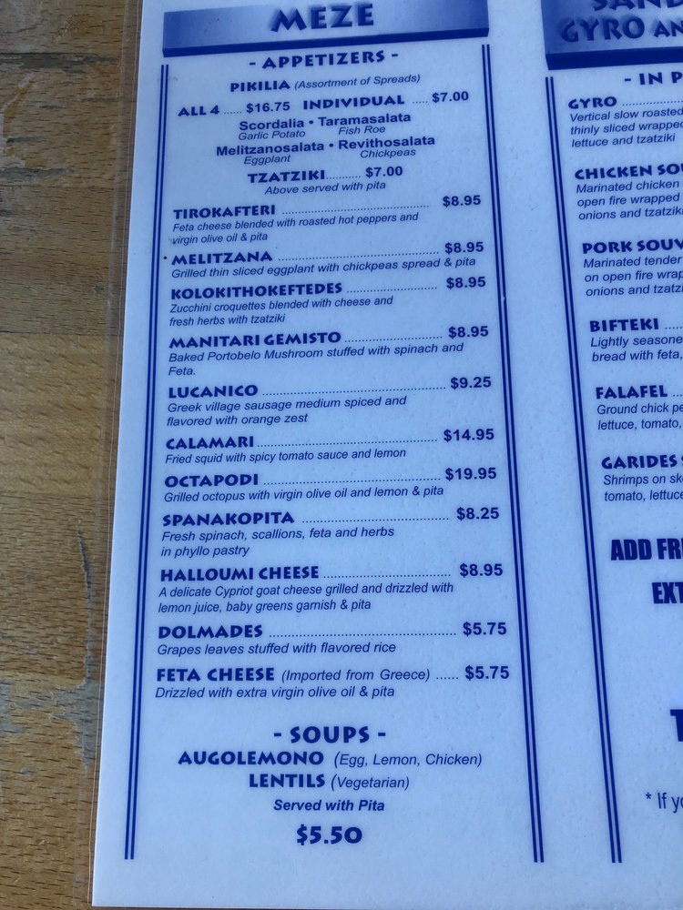 Lightly seasoned Greek style burger served on open pita bread with feta, lettuce, tomato, onions, and tzatziki.